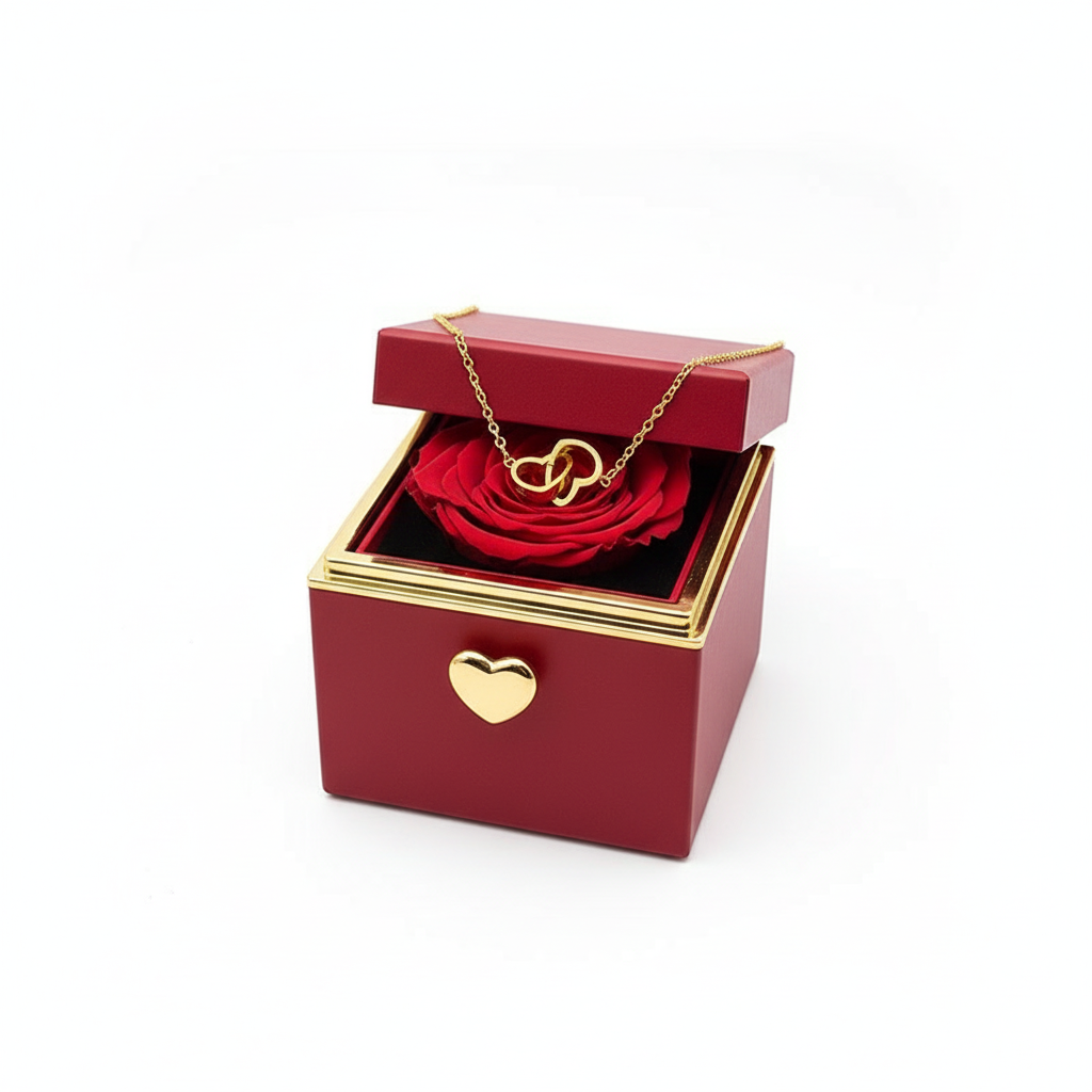 Elegant rotating box with eternal rose and stunning heart necklace inside
